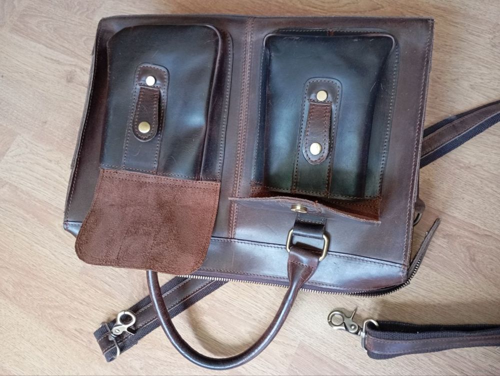 Благородная темно-коричневая кожа идеально сочетается с латунного цвета молниями и вашими коричневыми туфлями (ботинками)/перчатками. Кейс удобный, не массивный без лишнего пространства (документы: лист/папки А4 и некрупный ноутбук или лэптоп помещаются).