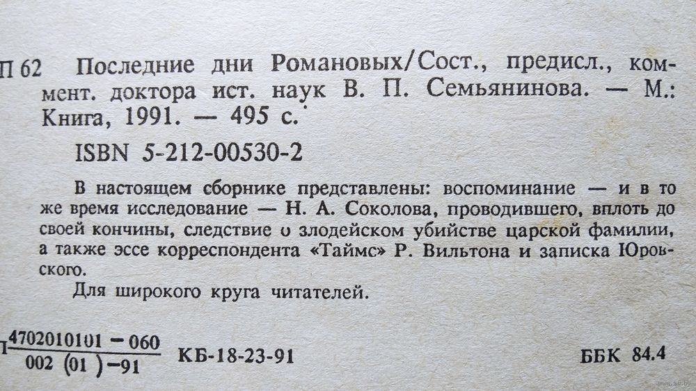 В сборнике представлены: воспоминание - и в то же время исследование - Н. А. Соколова, проводившего, вплоть до своей кончины, следствие о злодейском убийстве царской фамилии, а также эссе корреспондента Таймс Р. Вильтона и записка Юровского.