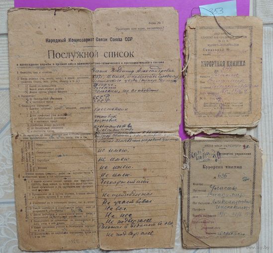 Послужной список (1937 г.) и две курортные книжки (1937, 1940), на одного человека