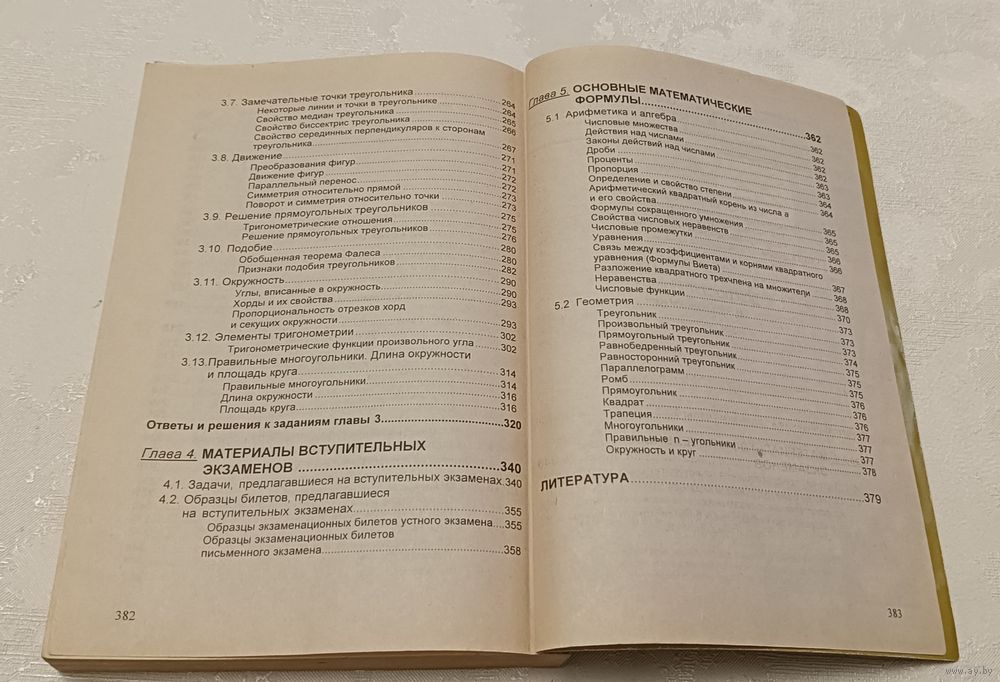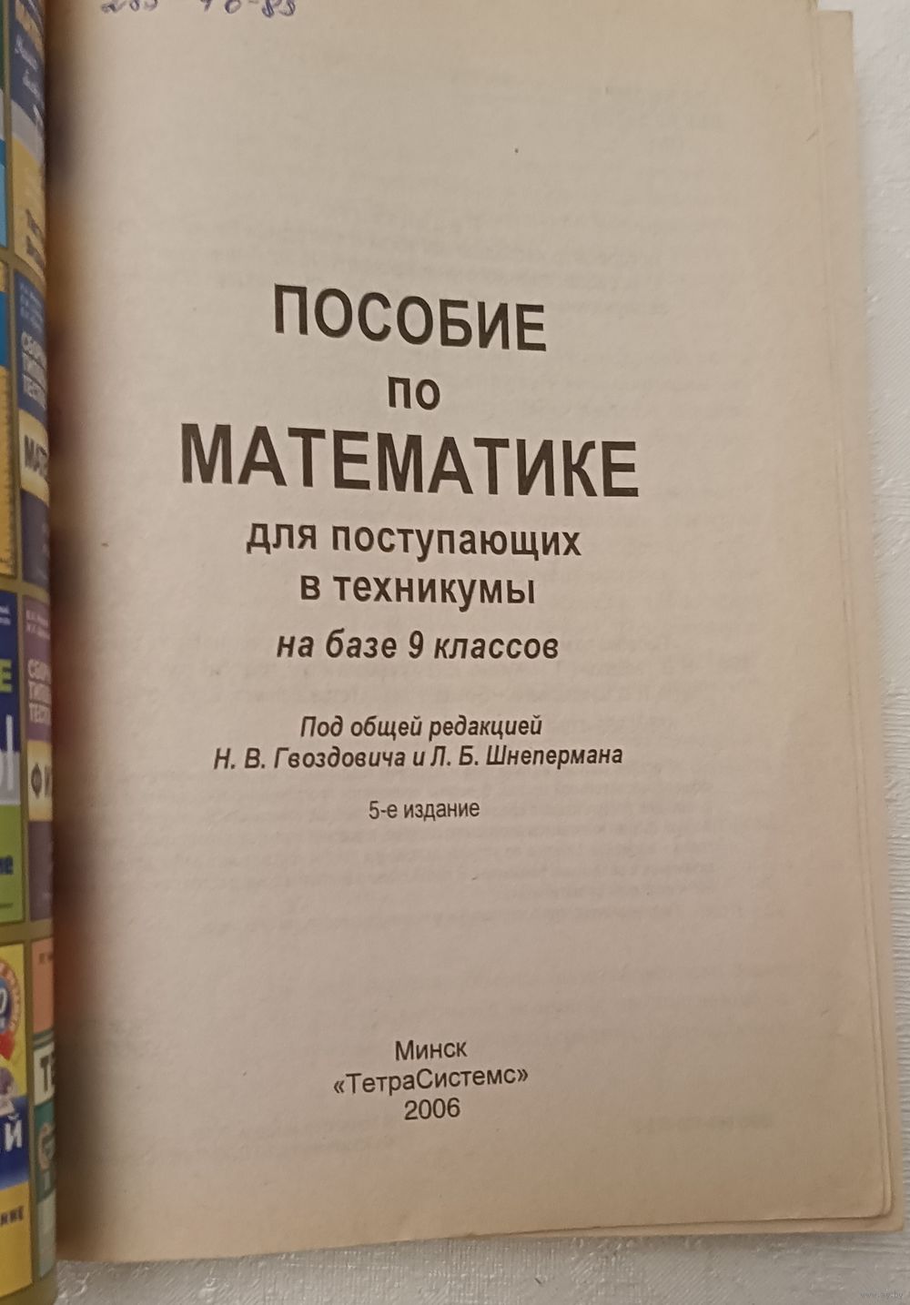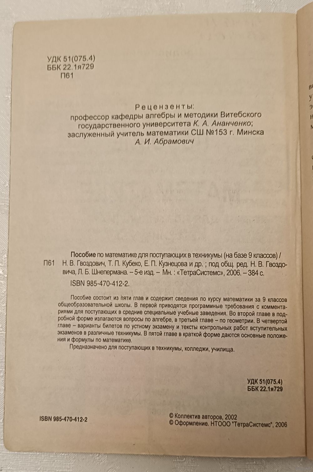 Пособие по математике для поступающих в техникумы (на базе 9 классов). Н. В. Гвоздович, Т. П. Кубеко, Е. П. Кузнецова и др.; под общ. ред. Н. В. Гвоздовича, Л. Б. Шнепермана. 5-е изд. Мн.: «Тетра Системс», 2006. – 384 с., мягкая обложка, обычный формат.
