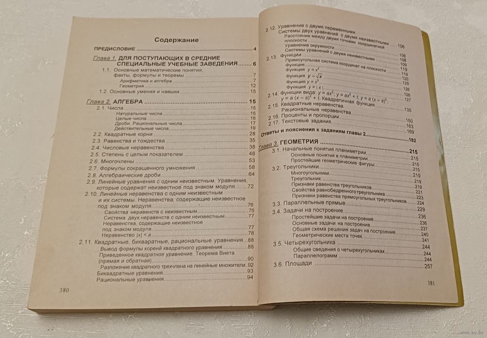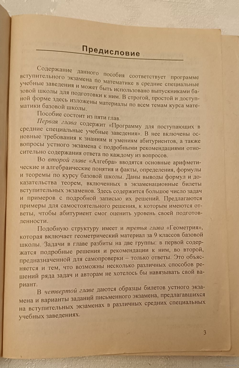 Пособие состоит из пяти глав и содержит сведения по курсу математики за 9 классов общеобразовательной школы. В первой приводятся программные требования с комментариями для поступающих в средние специальные учебные заведения. Во второй главе в подробной форме излагаются вопросы по алгебре, в третьей главе по геометрии. В четвертой главе варианты билетов по устному экзамену и тексты контрольных работ вступительных экзаменов в различные техникумы. В пятой главе в краткой форме даются основные положения и формулы по математике. Предназначено для поступающих в техникумы, колледжи, училища.
