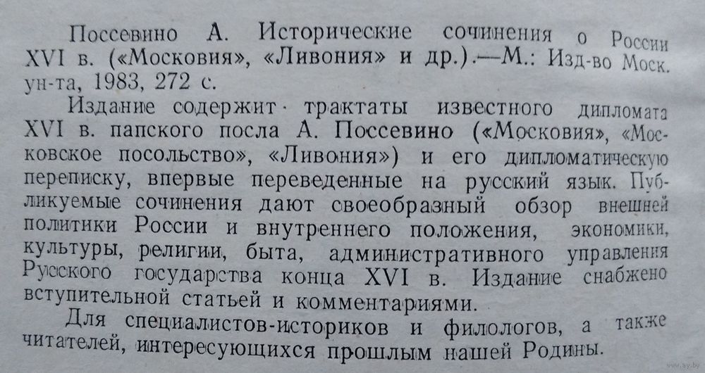 Поссевино А. Исторические сочинения о России XVI в. (Московия, Ливония и др.). М. МГУ 1983г. 272 с. Твердый переплет, Увеличенный формат.