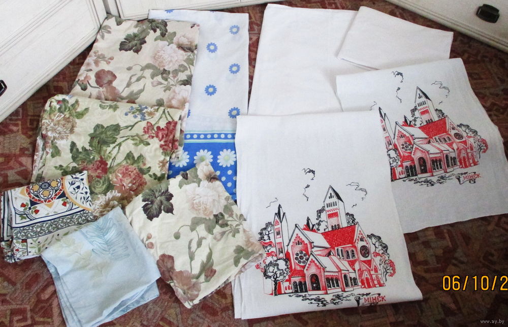 4 простыни-136,136,140,145см. 2 думки-45х50,с молнией 40х40.Цветная наволчка 67х47,белая 48х68. 2 рушника,лен 44х145см. На одном небольшие пятнышки(фото)