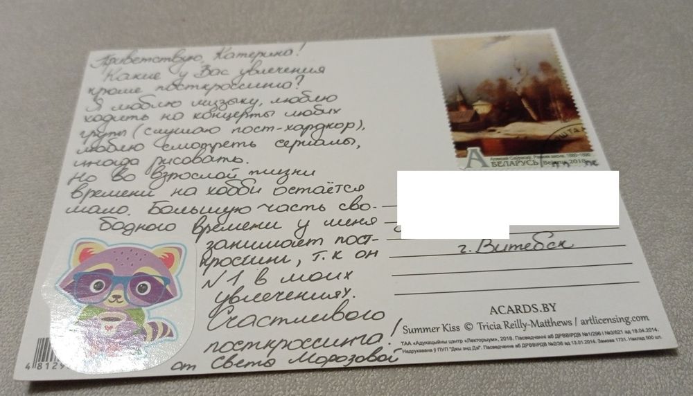 Посткроссинг. Открытка. 500 экз. Прошла почту. Штемпель. Передача в Витебске при личной встрече возле ратуши. Пересылка в другой город за счёт покупателя по тарифам Белпочты либо Европочты после 100% предоплаты.