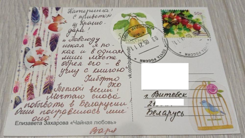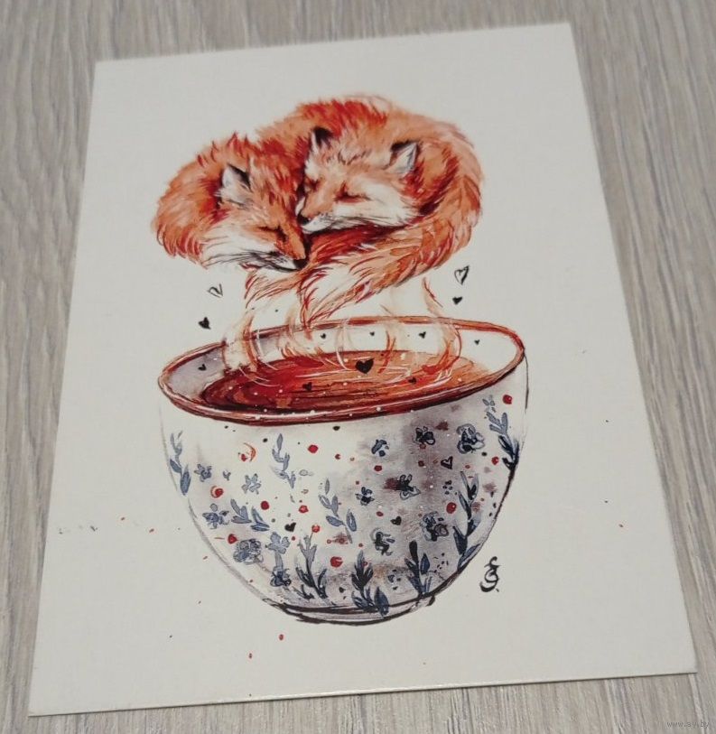 Посткроссинг. Открытка "Чайная любовь", худ.Елизавета Захарова (10х15). Прошла почту. Художественная, ароматизированная марка, чёткий штемпель. Передача в Витебске при личной встрече возле ратуши. Пересылка в другой город за счёт покупателя по тарифам Белпочты либо Европочты после 100% предоплаты.