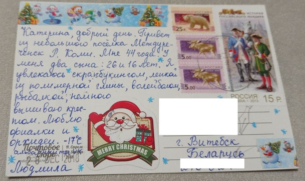 Посткроссинг. Открытка Девочка с ёлкой (10х15). Прошла почту. Художественные марки, чёткий штемпель. Передача в Витебске при личной встрече возле ратуши. Пересылка в другой город за счёт покупателя по тарифам Белпочты либо Европочты после 100% предоплаты.