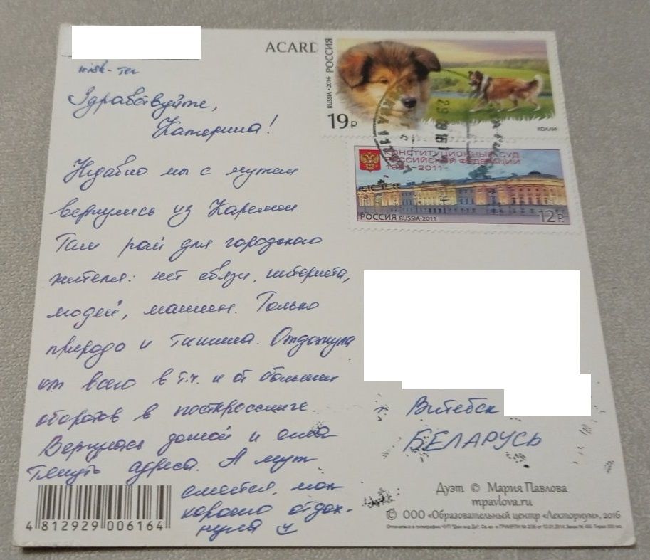 Посткроссинг. Открытка "Дуэт", худ.Мария Павлова (13,5х13,5). Прошла почту. Художественные марки, чёткий штемпель. Передача в Витебске при личной встрече возле ратуши. Пересылка в другой город за счёт покупателя по тарифам Белпочты либо Европочты после 100% предоплаты.