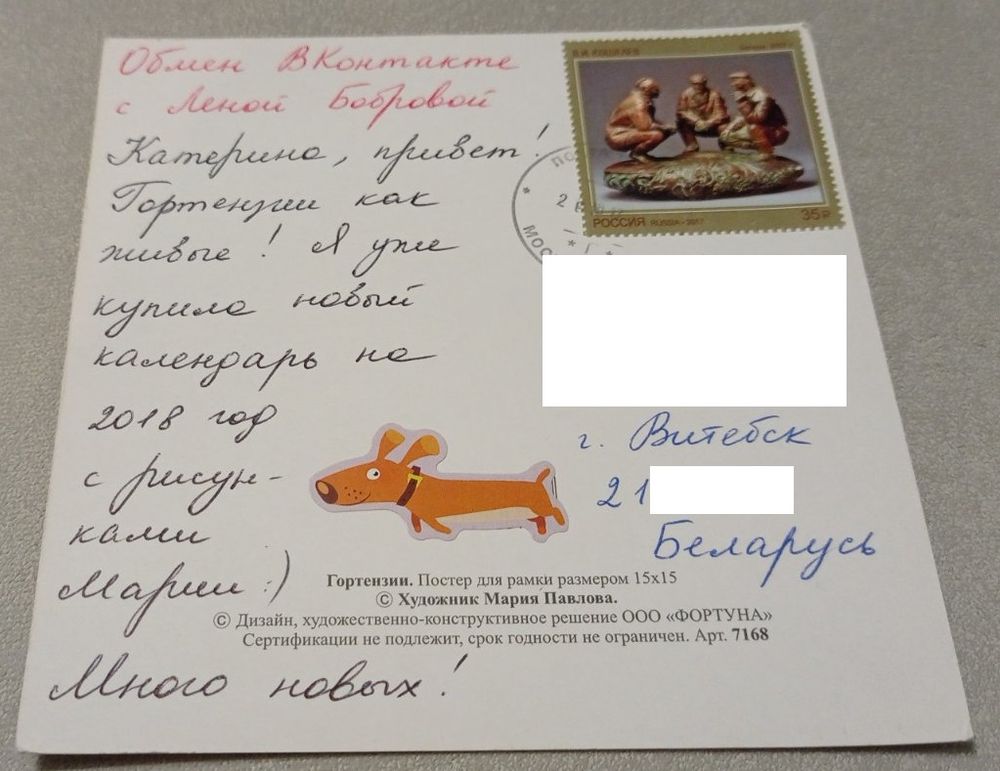 Посткроссинг. Открытка "Гортензии", худ.Мария Павлова (15х15). Прошла почту. Художественные марки, чёткий штемпель.. Передача в Витебске при личной встрече возле ратуши. Пересылка в другой город за счёт покупателя по тарифам Белпочты либо Европочты после 100% предоплаты.