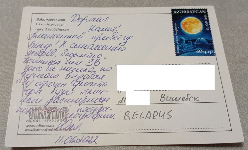 Посткроссинг. Открытка из Азербайджана: Баку (10х15). Прошла почту. Художественная марка. Передача в Витебске при личной встрече возле ратуши. Пересылка в другой город за счёт покупателя по тарифам Белпочты либо Европочты после 100% предоплаты.