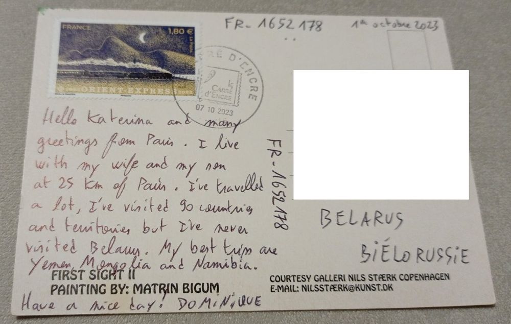 Посткроссинг. Открытка из Франции: Первая сторона II, худ.Матрин Бижум (10х15). Прошла почту. Художественные марки, чёткий штемпель. Передача в Витебске при личной встрече возле ратуши. Пересылка в другой город за счёт покупателя по тарифам Белпочты либо Европочты после 100% предоплаты.