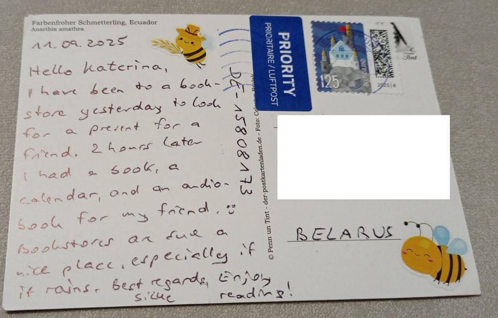 Посткроссинг. Открытка из Германии: бабочка (10х15). Прошла почту. Художественные марки, чёткий штемпель.. Передача в Витебске при личной встрече возле ратуши. Пересылка в другой город за счёт покупателя по тарифам Белпочты либо Европочты после 100% предоплаты.