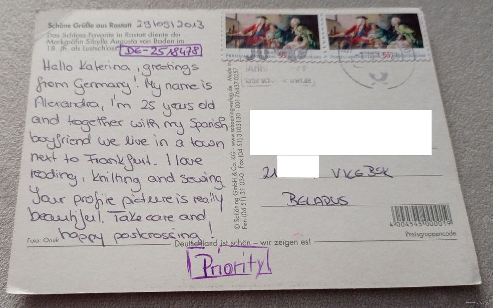 Посткроссинг. Открытка из Германии: Раштатт, дворец (10х15). Прошла почту. Марки, чёткий штемпель. Передача в Витебске при личной встрече возле ратуши. Пересылка в другой город за счёт покупателя по тарифам Белпочты либо Европочты после 100% предоплаты.