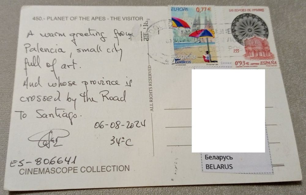 Посткроссинг. Открытка из Испании: "Планета обезьян" (10х15). Прошла почту. Художественные марки EuropaCept, чёткий штемпель. Передача в Витебске при личной встрече возле ратуши. Пересылка в другой город за счёт покупателя по тарифам Белпочты либо Европочты после 100% предоплаты.