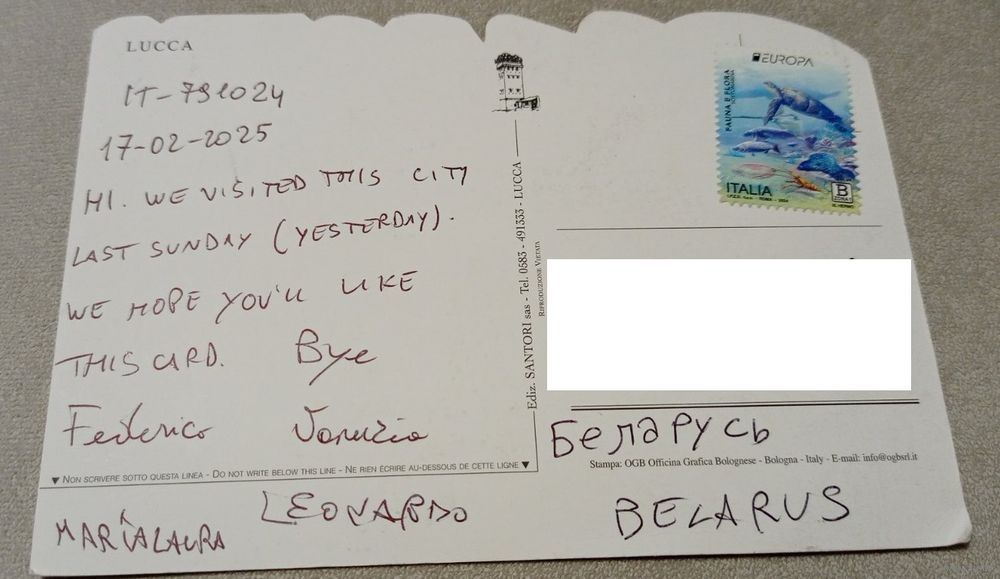 Посткроссинг. Открытка из Италии: Салюти-да-Лукка (11х16,5). Прошла почту. Художественные марки, чёткий штемпель. Передача в Витебске при личной встрече возле ратуши. Пересылка в другой город за счёт покупателя по тарифам Белпочты либо Европочты после 100% предоплаты.
