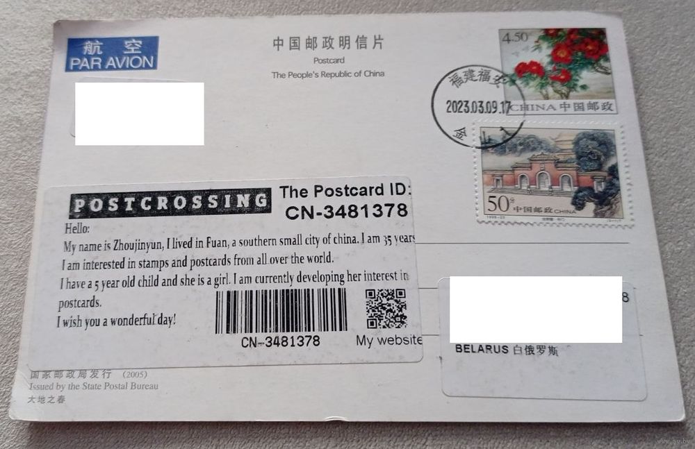 Посткроссинг. Открытка из Китая: Шэньян (11,5х16,5). Прошла почту. Художественные марки, чёткий штемпель.. Передача в Витебске при личной встрече возле ратуши. Пересылка в другой город за счёт покупателя по тарифам Белпочты либо Европочты после 100% предоплаты.
