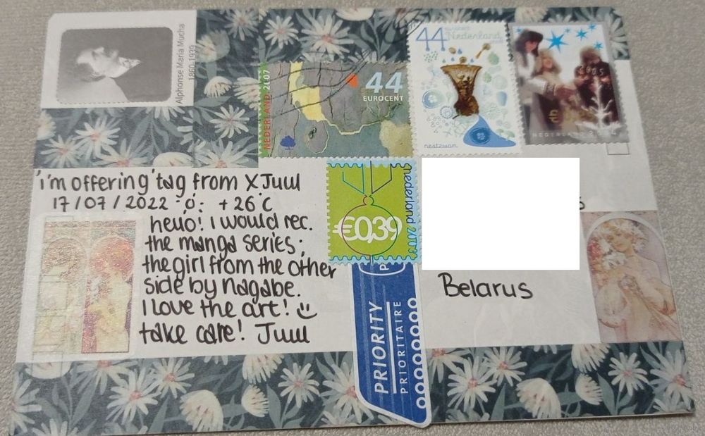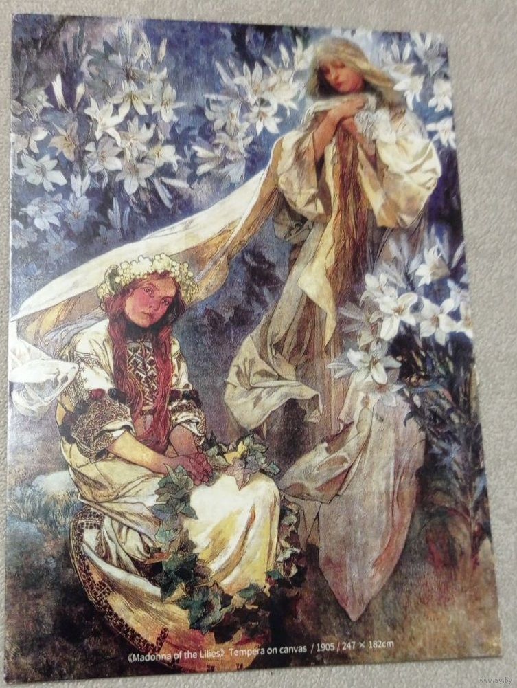 Посткроссинг. Открытка из Нидерландов: Мадонна лилий, худ.Альфонс Муха (10х15). Прошла почту. Художественные марки, чёткий штемпель. Передача в Витебске при личной встрече возле ратуши. Пересылка в другой город за счёт покупателя по тарифам Белпочты либо Европочты после 100% предоплаты.