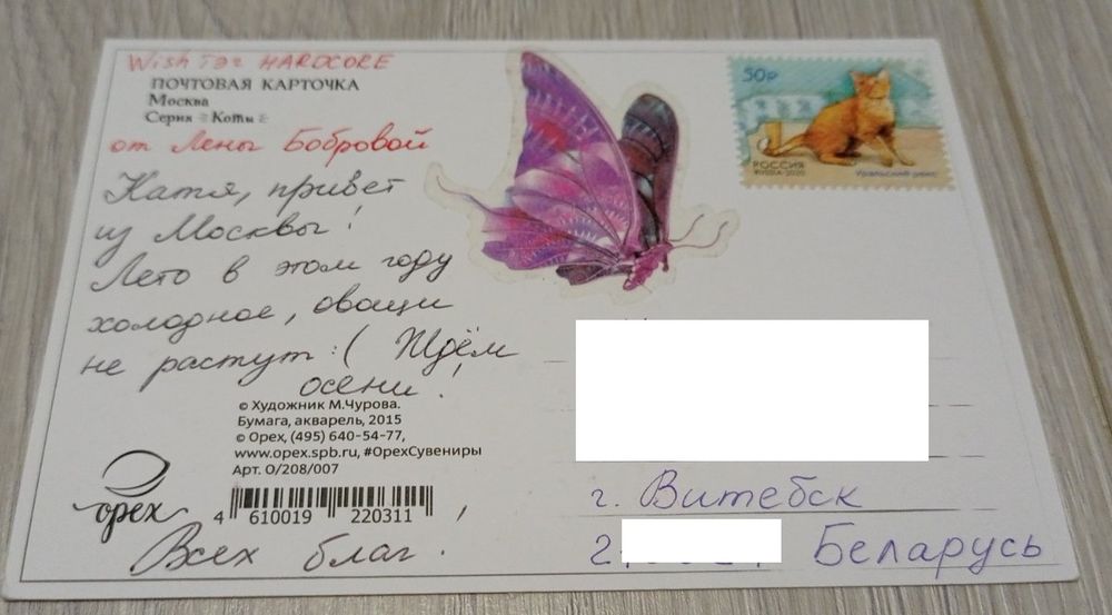 Посткроссинг. Открытка из серии "Коты", худ.М.Чурова (10х15). Прошла почту. Художественная марка.. Передача в Витебске при личной встрече возле ратуши. Пересылка в другой город за счёт покупателя по тарифам Белпочты либо Европочты после 100% предоплаты.