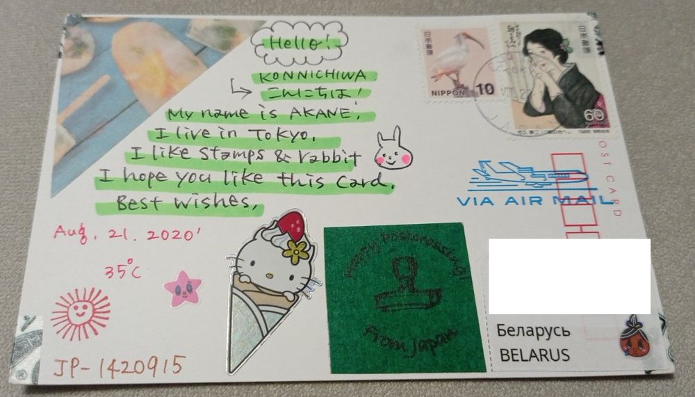 Посткроссинг. Открытка из Японии: чёрные человечки (10х15). Прошла почту. Художественные марки, чёткий штемпель.. Передача в Витебске при личной встрече возле ратуши. Пересылка в другой город за счёт покупателя по тарифам Белпочты либо Европочты после 100% предоплаты.