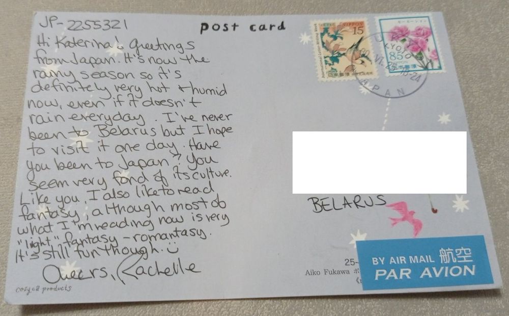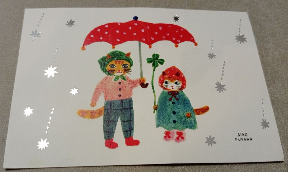 Посткроссинг. Открытка из Японии: коты подзонтом, худ.Аико Фукава (10х15). Прошла почту. Художественные марки. Передача в Витебске при личной встрече возле ратуши. Пересылка в другой город за счёт покупателя по тарифам Белпочты либо Европочты после 100% предоплаты.