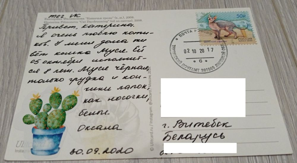 Посткроссинг. Открытка "Кошачьи грёзы", худ.Екатерина Филимонова (10х15). Прошла почту. Художественная марка, чёткий штемпель. Передача в Витебске при личной встрече возле ратуши. Пересылка в другой город за счёт покупателя по тарифам Белпочты либо Европочты после 100% предоплаты.