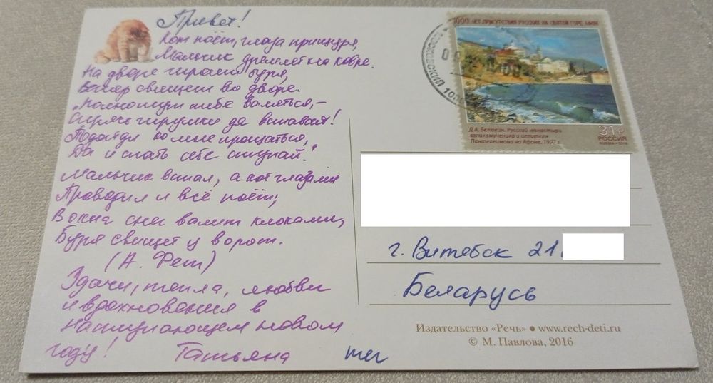 Посткроссинг. Открытка: кот и подушка, худ.М.Павлова (11,5х16,5), издательство "Речь". Прошла почту. Художественная марка. штемпель. Передача в Витебске при личной встрече возле ратуши. Пересылка в другой город за счёт покупателя по тарифам Белпочты либо Европочты после 100% предоплаты.