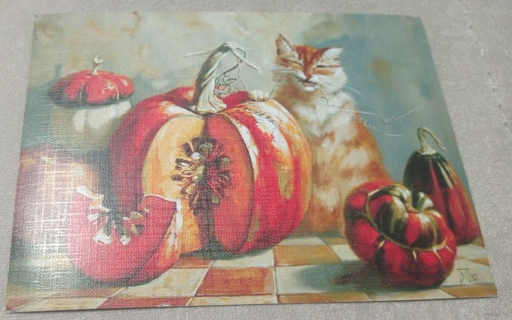 Посткроссинг. Открытка "Тыквы и кот", худ.Мария Павлова (13х18). Прошла почту. Художественные марки, чёткий штемпель.. Передача в Витебске при личной встрече возле ратуши. Пересылка в другой город за счёт покупателя по тарифам Белпочты либо Европочты после 100% предоплаты.