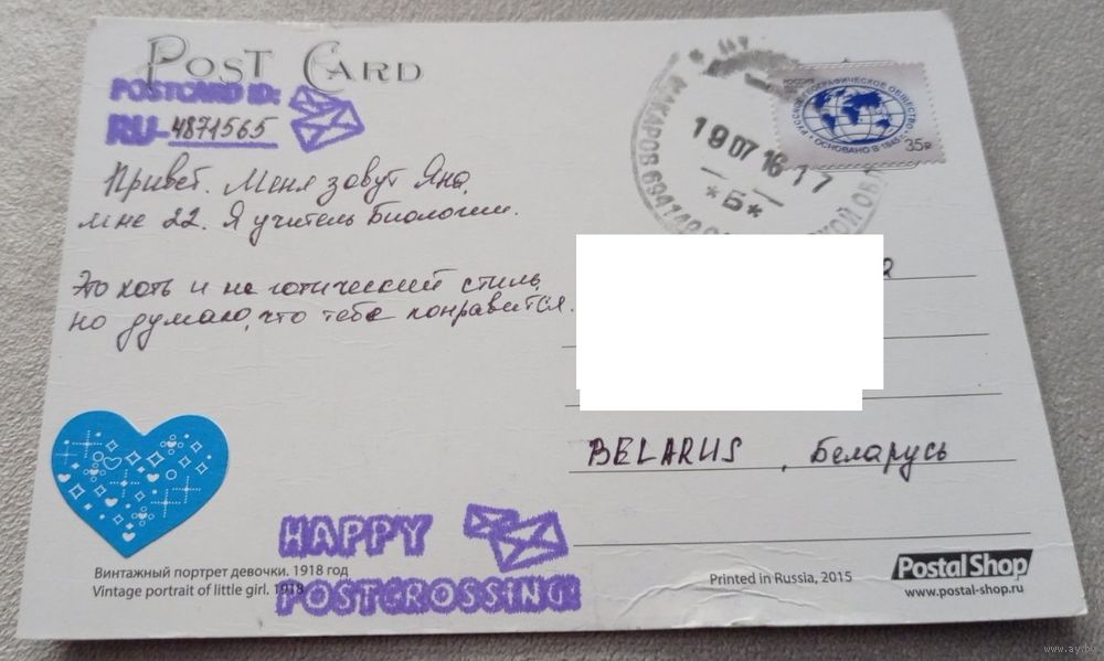 Посткроссинг. Открытка "Винтажный портрет девочки. 1918 год" (10х15). Прошла почту. Марка, чёткий штемпель. Передача в Витебске при личной встрече возле ратуши. Пересылка в другой город за счёт покупателя по тарифам Белпочты либо Европочты после 100% предоплаты.