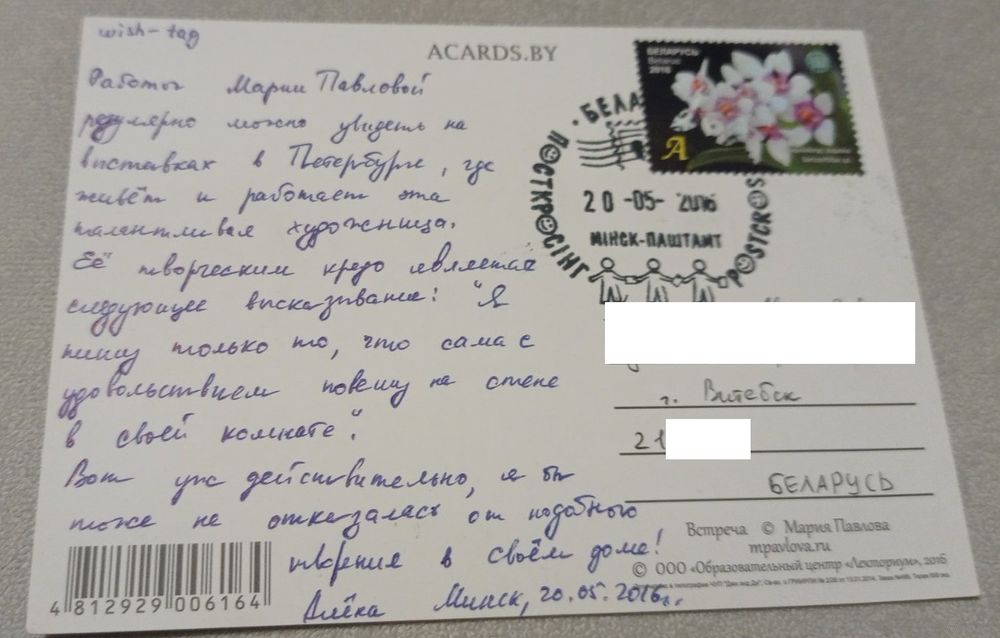 Посткроссинг. Открытка "Встреча", худ.Мария Павлова (10х15). Прошла почту. Художественные марки, чёткий штемпель.. Передача в Витебске при личной встрече возле ратуши. Пересылка в другой город за счёт покупателя по тарифам Белпочты либо Европочты после 100% предоплаты.