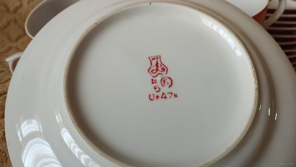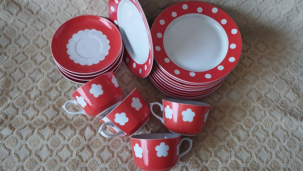 12 больших тарелок, 4 маленьких, 4 чашки.