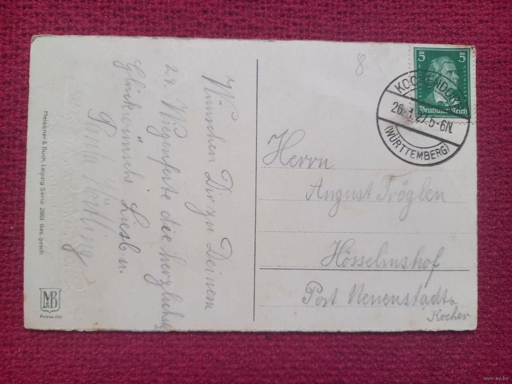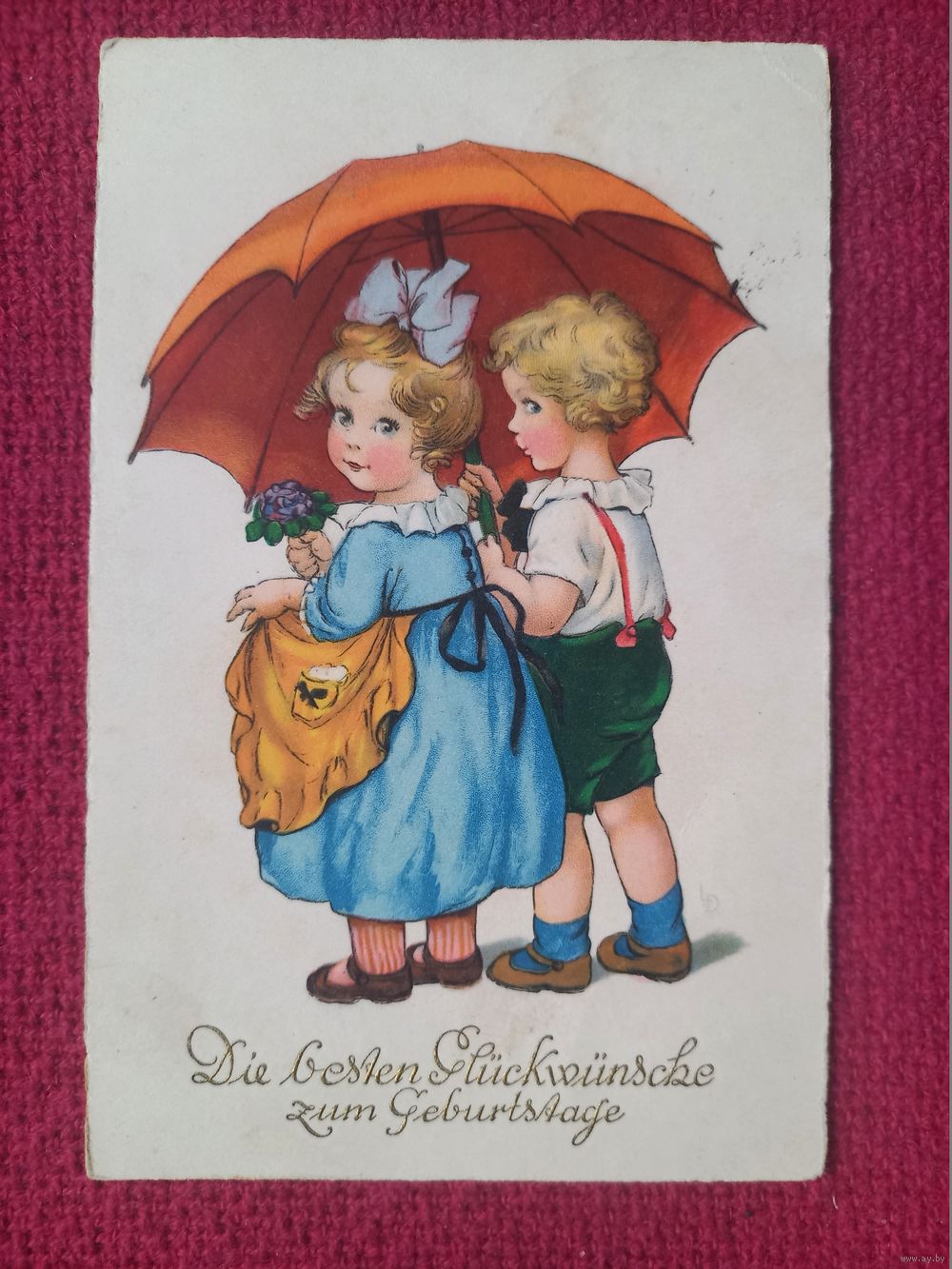 Поздравительная открытка. Германия. Девочка, Мальчик под зонтиком.