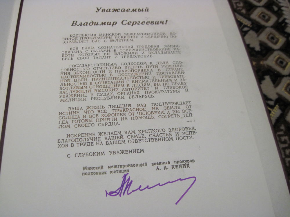 Поздравительный адрес 1993 г. известному государственному деятелю БССР И РБ от Минского межгарнизонного военного прокурора РБ. Торги!