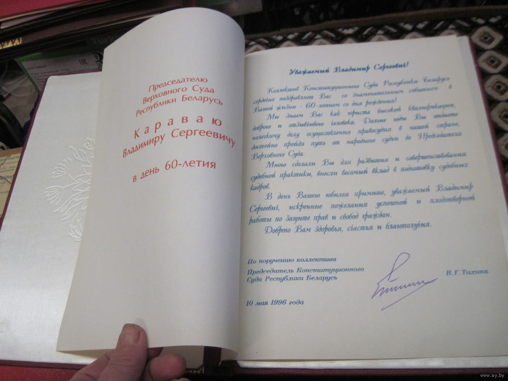 Поздравительный адрес 1996 г. известному государственному деятелю БССР И РБ от Председателя Конституционного суда РБ. Торги!