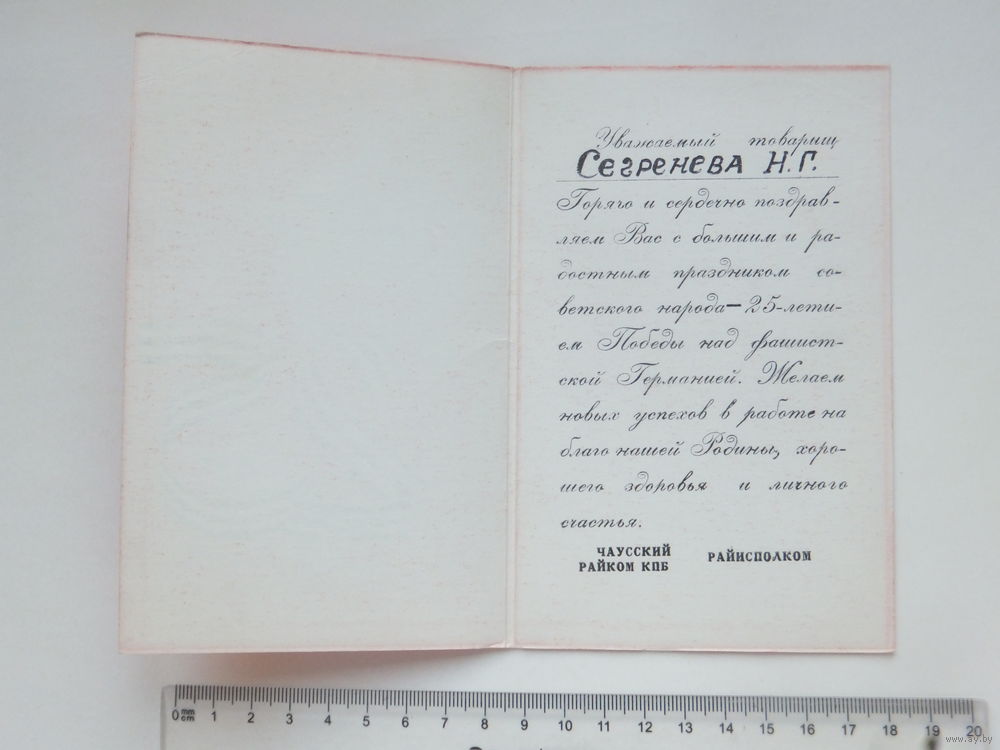 Поздравление 25 лет Победы Чаусский райком КПБ 1970 г г