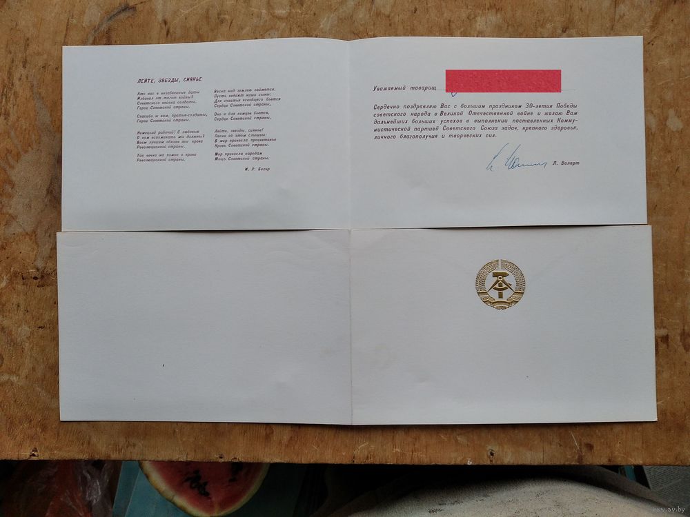 Поздравление Генерального консула ГДР в Минске с 30-летием Победы. 1974 г..