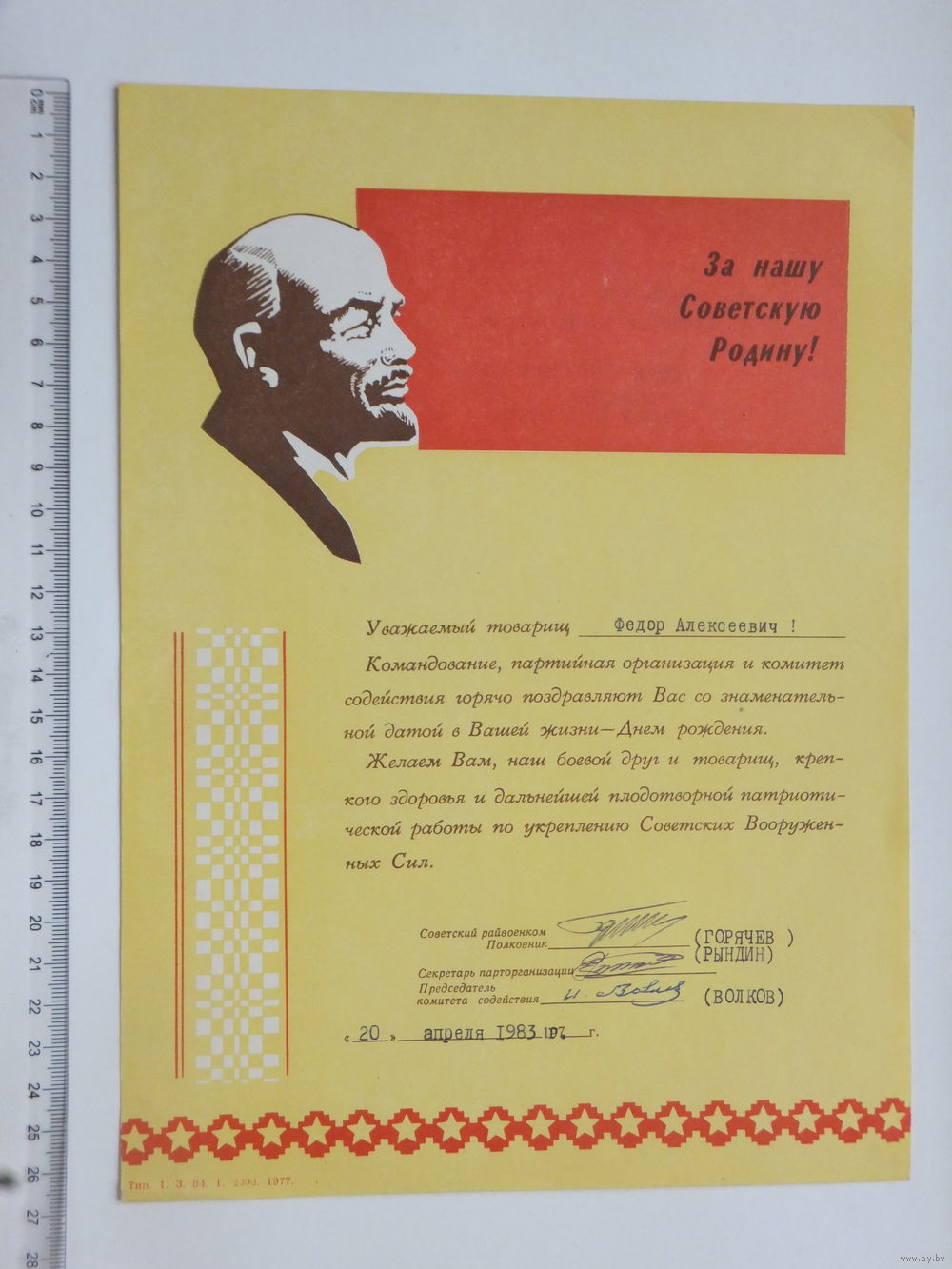 Поздравление от военкома Советского района Минска 1983