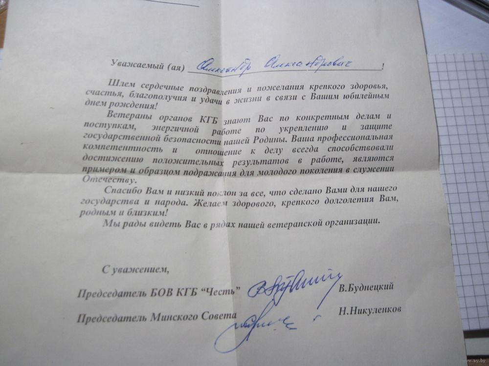Поздравление с юбилеем от Белорусской организации ветеранов КГБ "Честь" 1999 г с рубля!