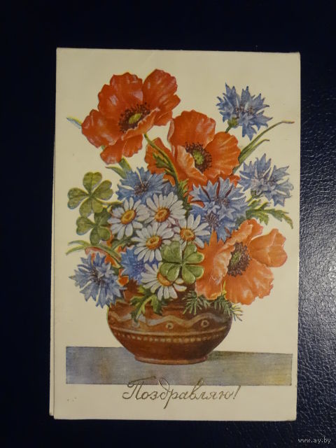 Поздравляю! Букет в вазе. 1958 г. подписанная. двойная.