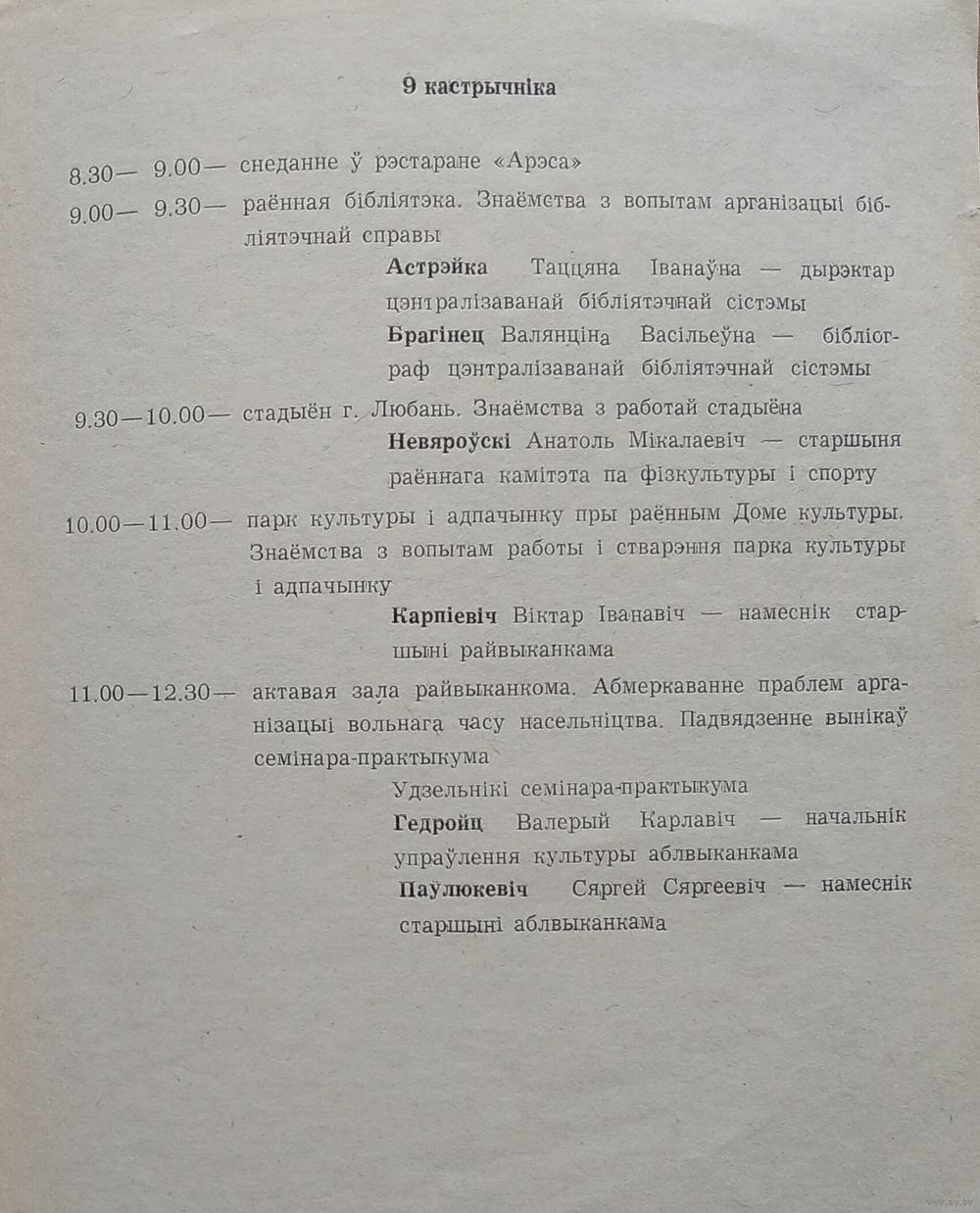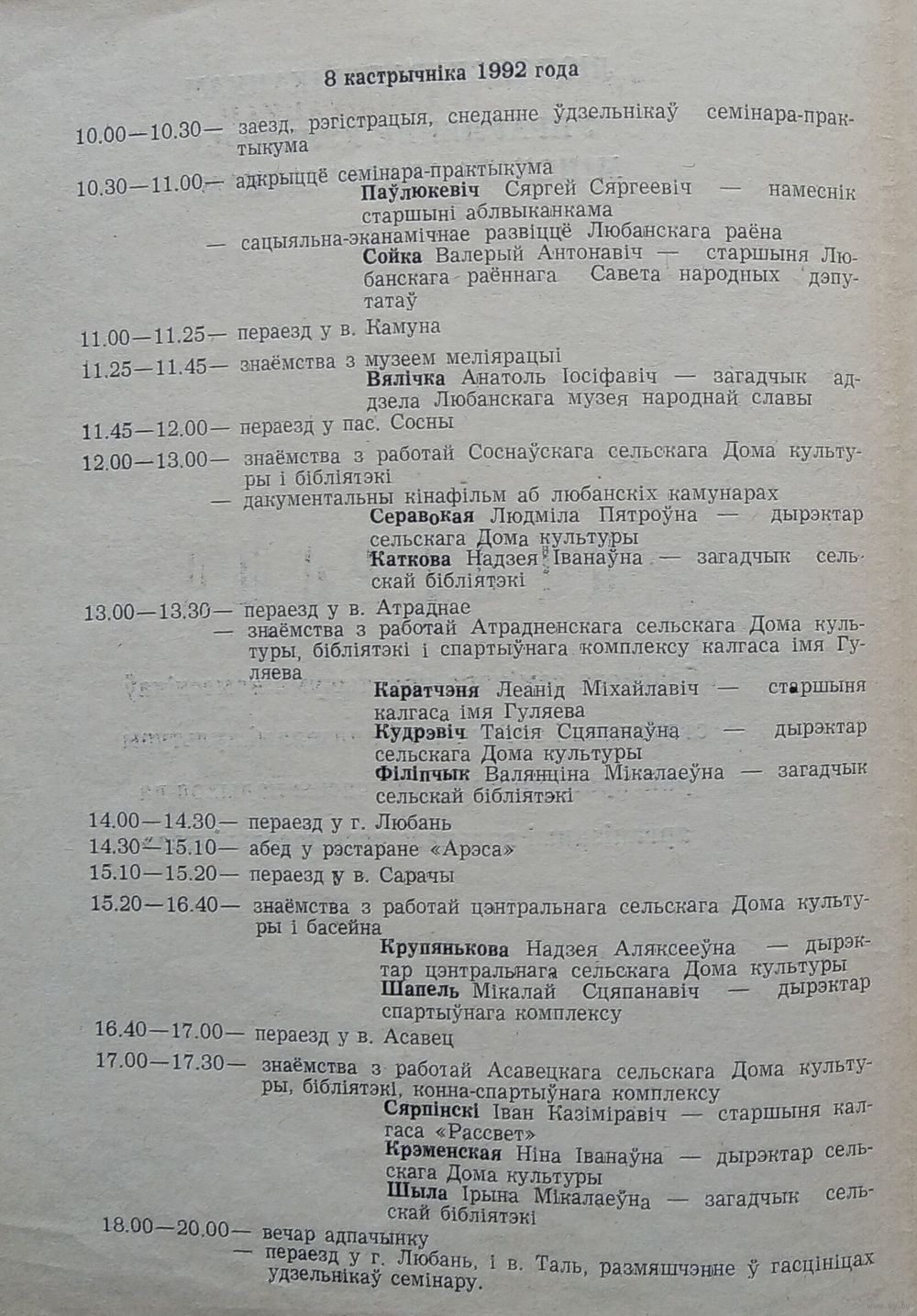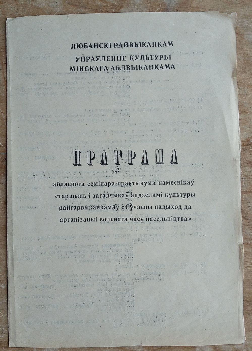 Праграма семінара "Сучасны падход да арганізацыі вольнага часу насельніцтва". Любань 1992 г.