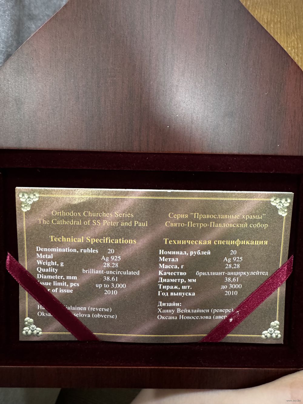в центре – рельефное изображение находящегося в Санкт-Петербурге Свято-Петро-Павловского собора, шпиль и купол которого исполнены тампопечатью; вверху по кругу надпись: СВЯТО-ПЕТРО-ПАВЛОВСКИЙ СОБОР.