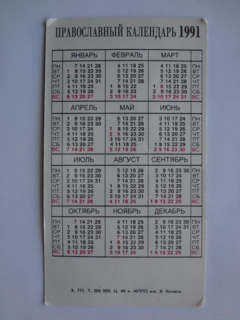 Православный календарь 1991 г.