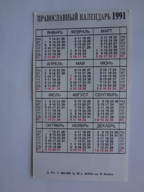 Православный календарь 1991 г.