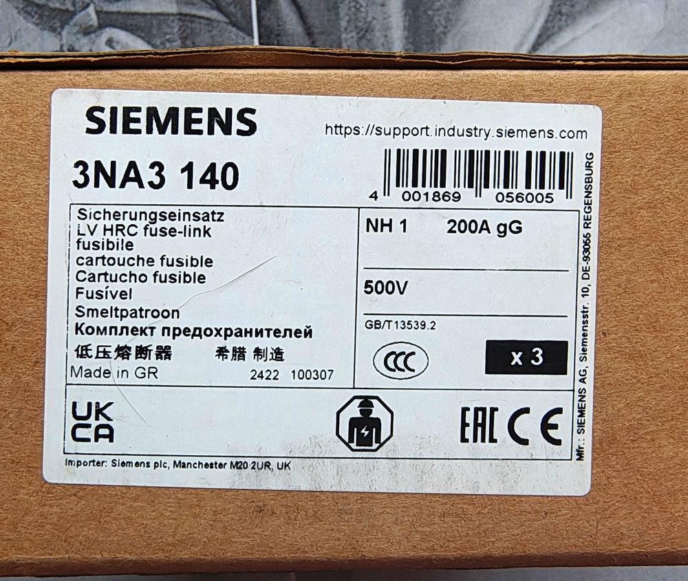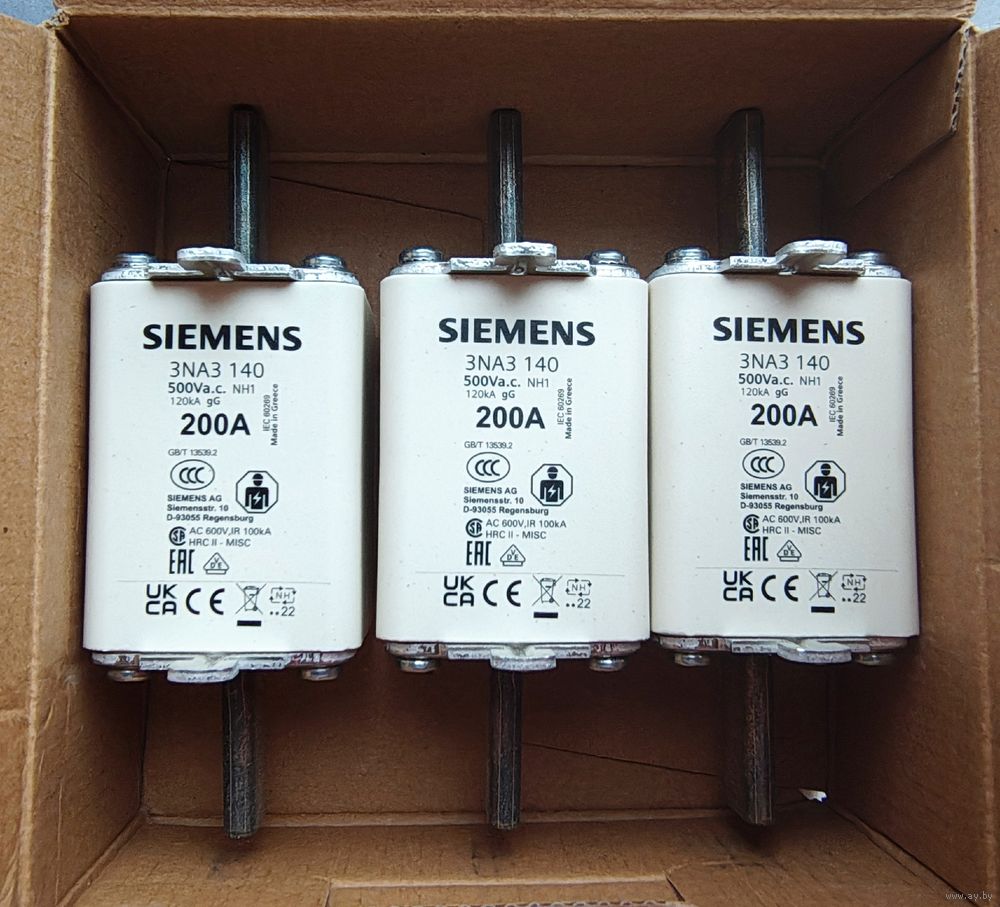 Предохранитель Siemens 3NA, низковольтный, GL/GG c неизолированными выступами для монтажа/демонтажа, типоразмер 1, Iном.=200A, Uном.=500В