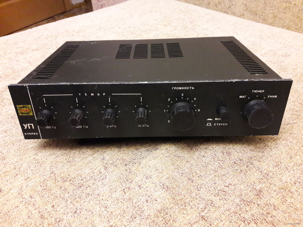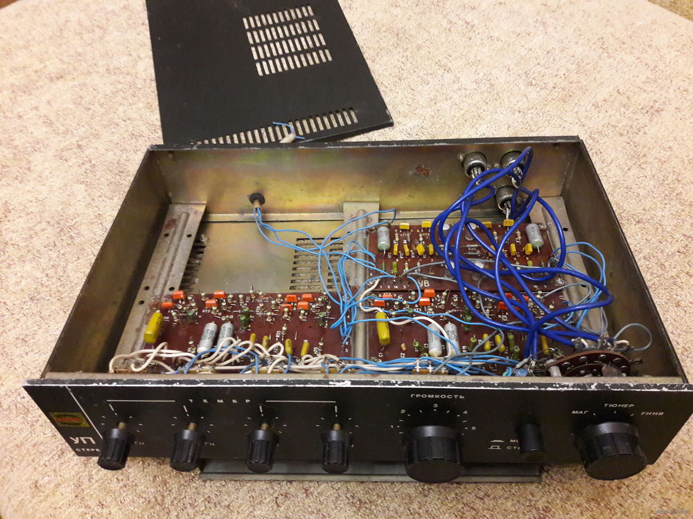 Платы, регуляторы и переключатели все на месте. Требует чистки и полной ревизии. В нагрузку неполный корпус от УМ - все, кроме лицевой и одной боковой панели. |
