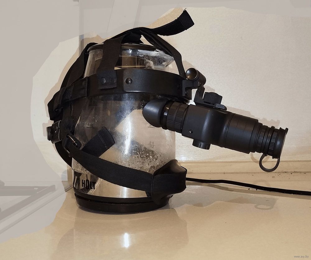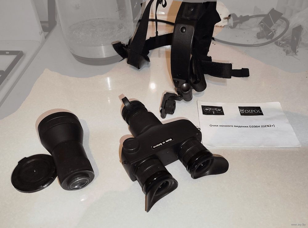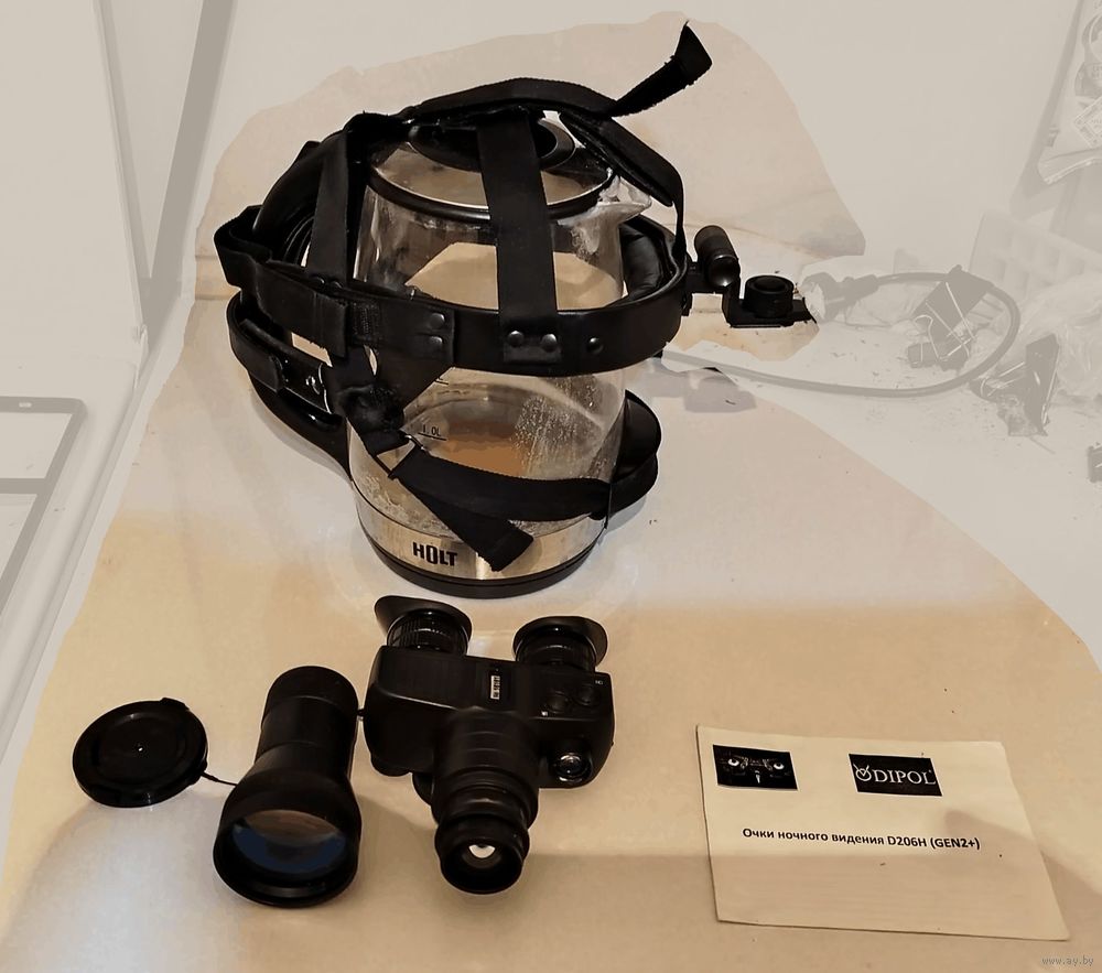 Прибор ночного видения Dipol D206H c маской, позволяющей крепить прибор на голове, и сменным объективом, дающим увеличение 4х. У штатного объектива увеличение 1х, то есть объекты через прибор видны такого же размера, как были бы видны невооружённым глазом. Комплектность на фото (ещё сумка; голова рядового Чайника в комплект не входит).