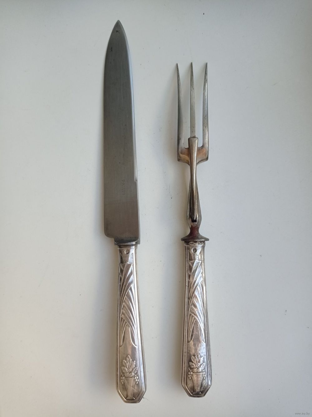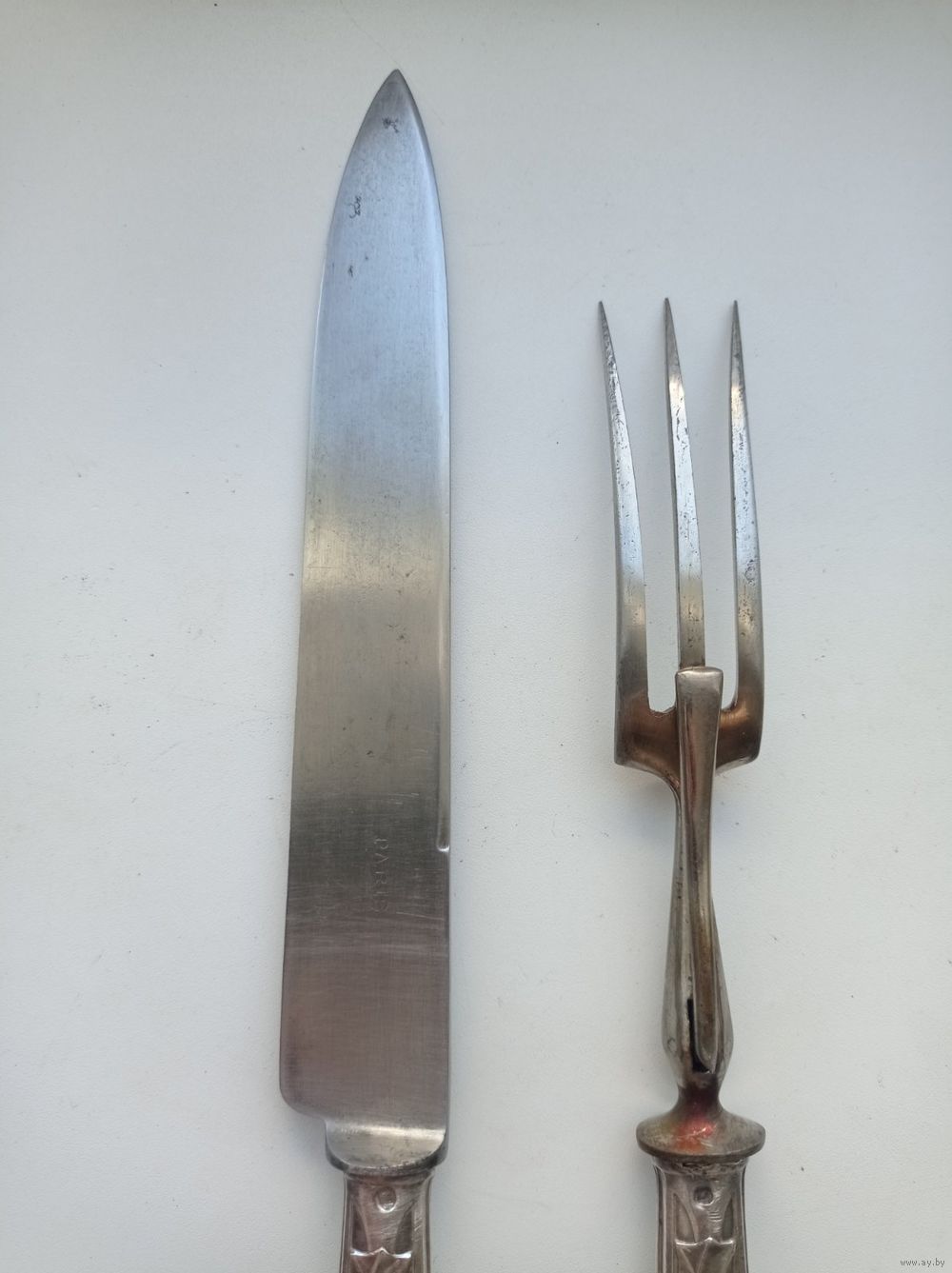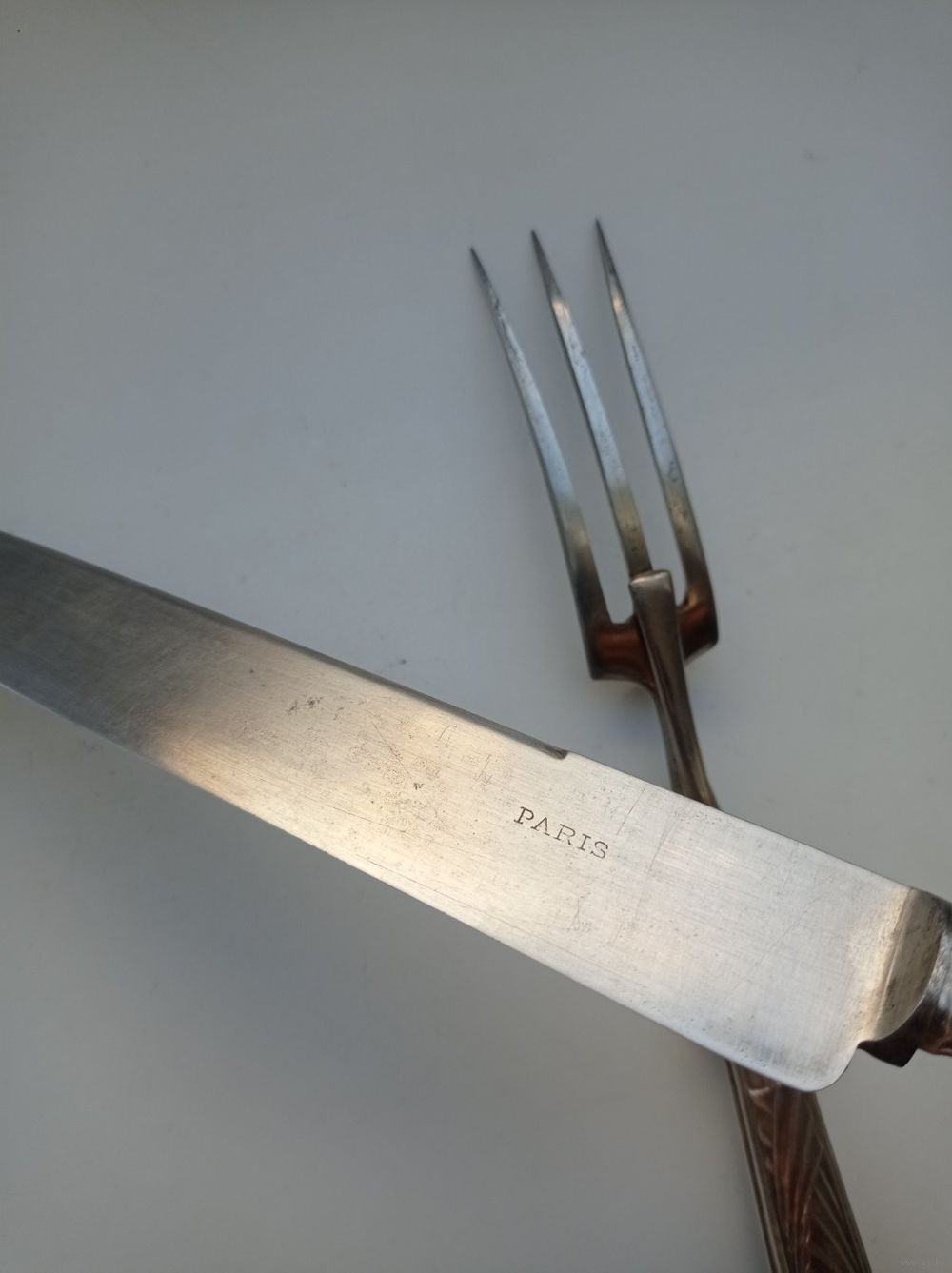 Рабочие части вилки и ножа для мяса выполнены из стали. На лезвии ножа стоит клеймо "Paris".