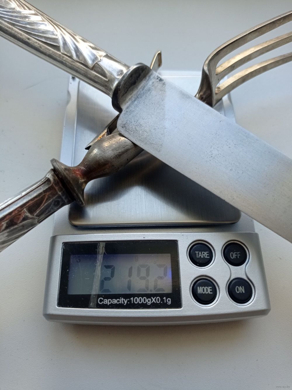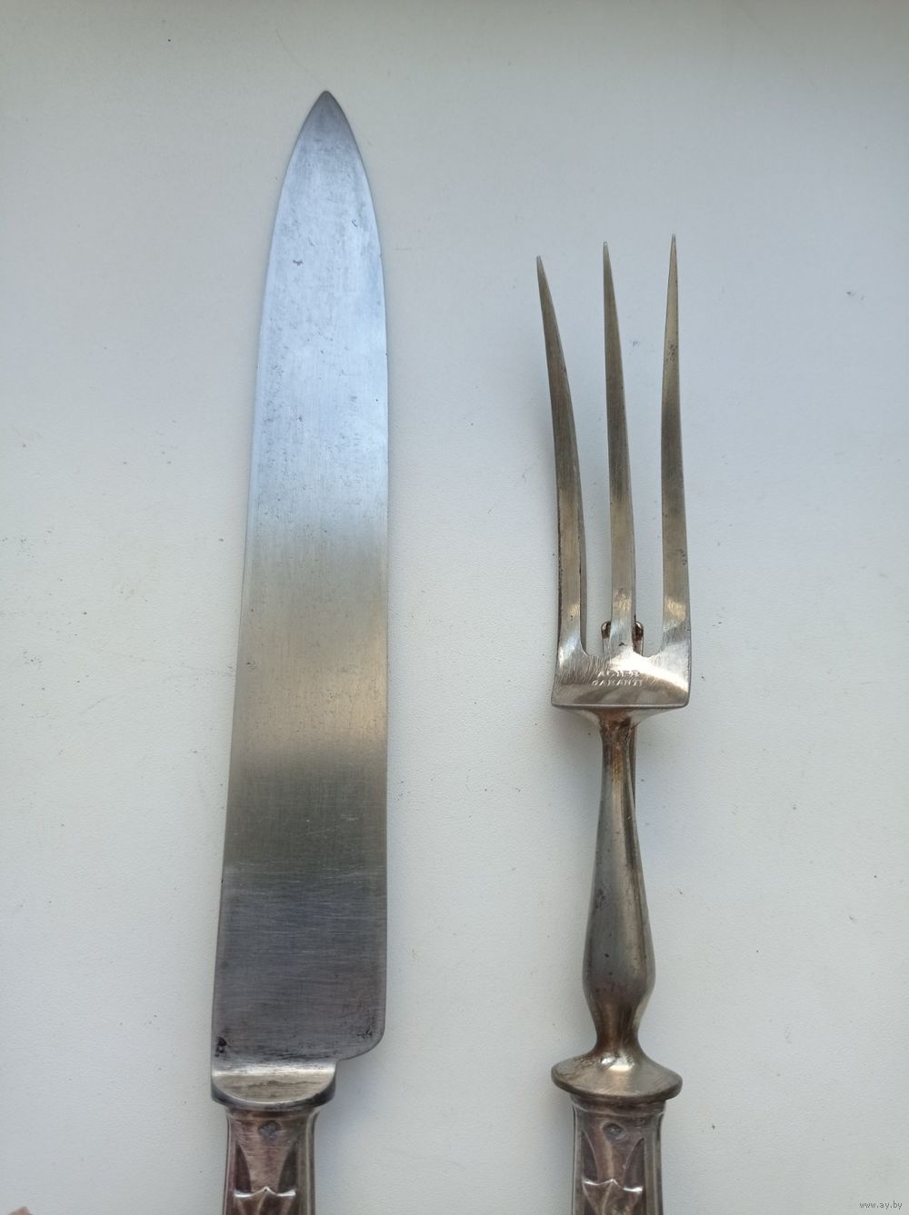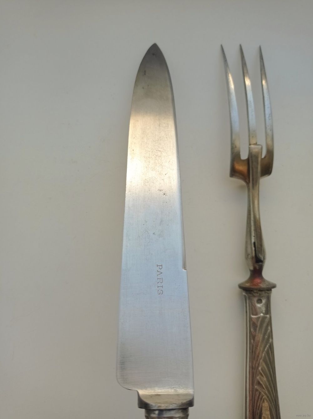 Рабочие части вилки и ножа для мяса выполнены из стали. На лезвии ножа стоит клеймо "Paris".