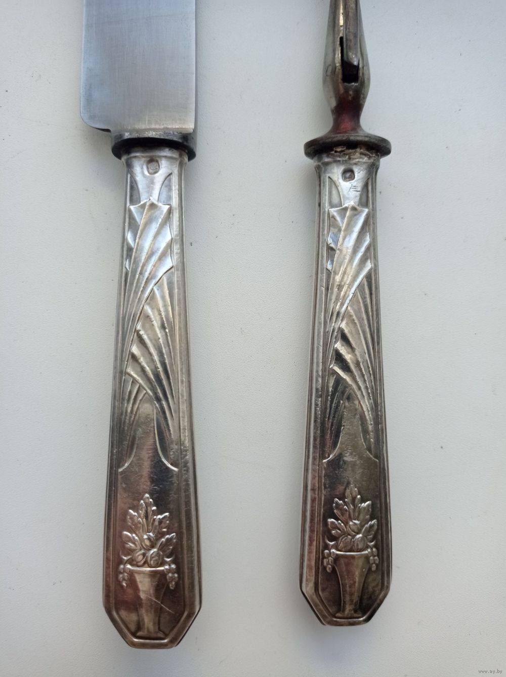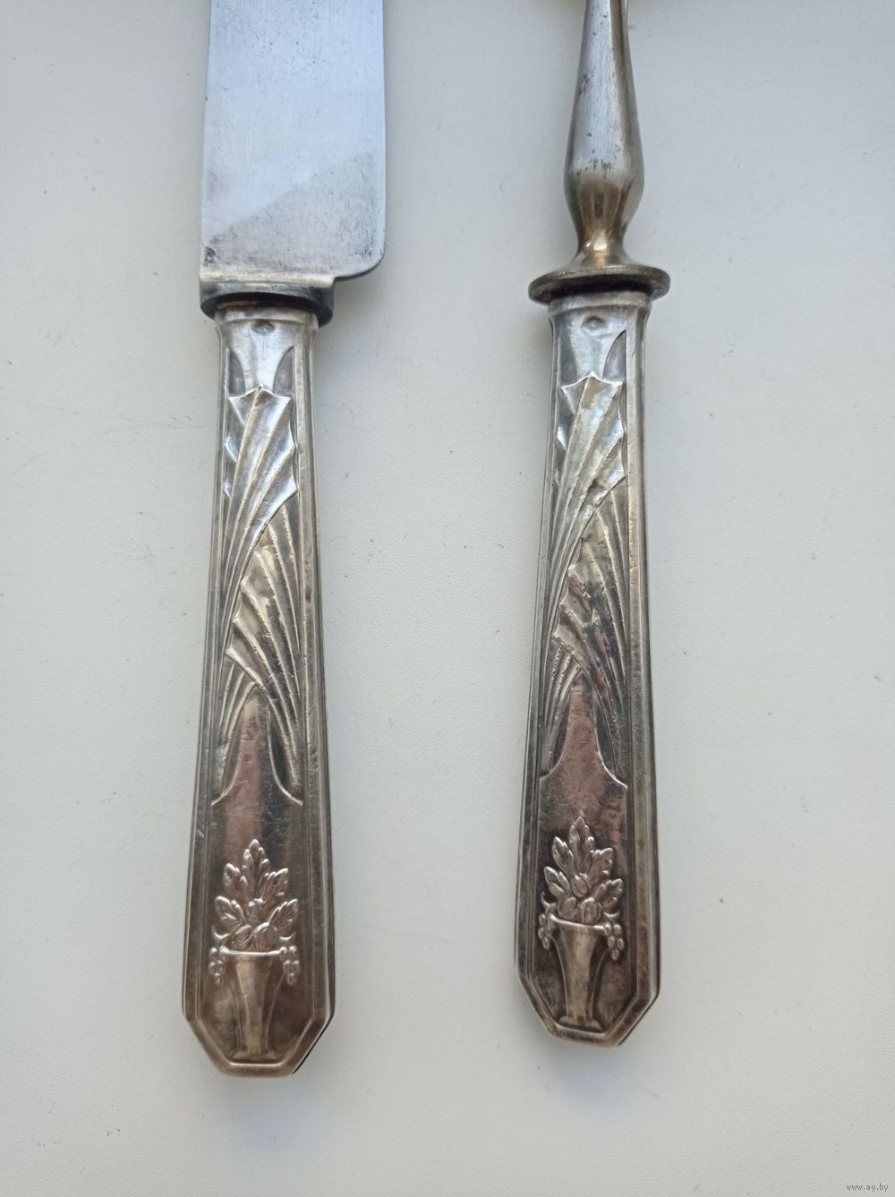 Рукояти приборов изготовлены из серебра, на на каждой рукояти стоит клеймо "Голова Минервы".