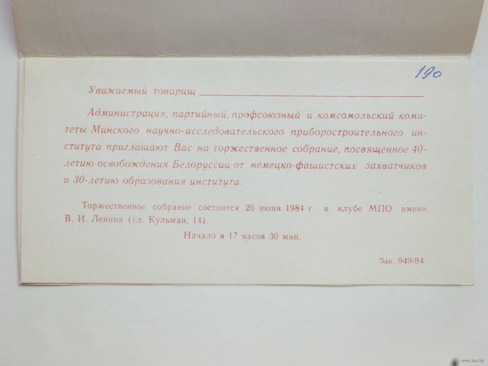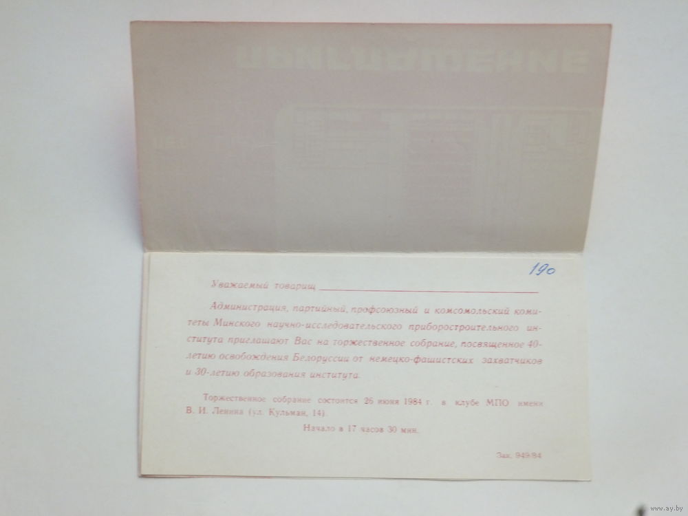 Приглашение 30 лет МНИПИ Минск 1984 г