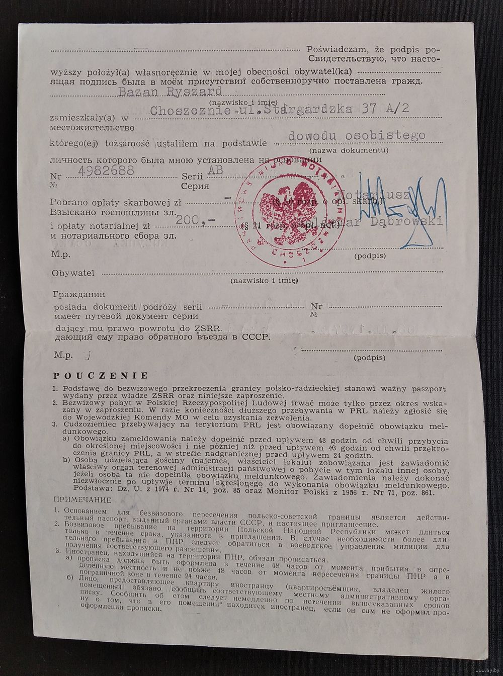 Приглашение для въезда в Польшу 1989 год