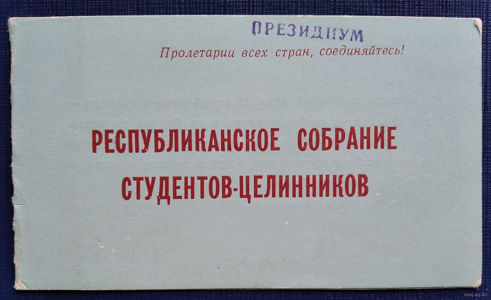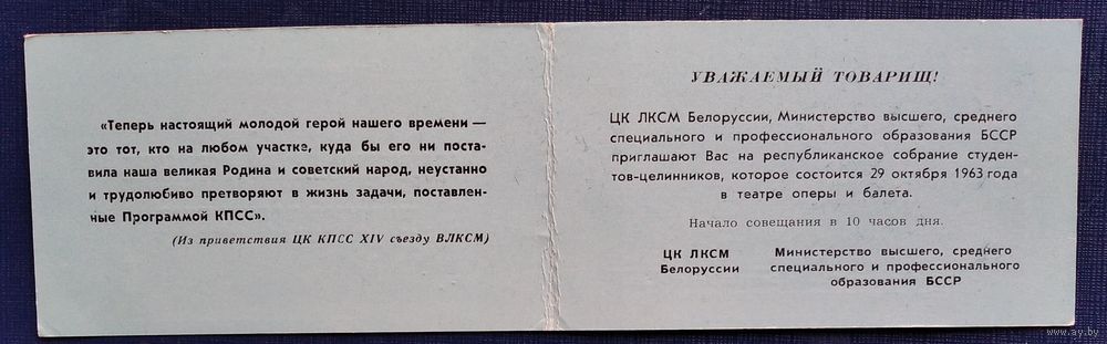 Приглашение на республиканское собрание студентов-целинников. Минск. 1963 г.